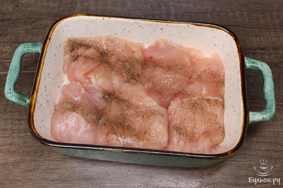 1. Куриное филе помойте, нарежьте его на кусочки и выложите в форму для запекания. Кусочки курицы посыпьте солью и перцем.