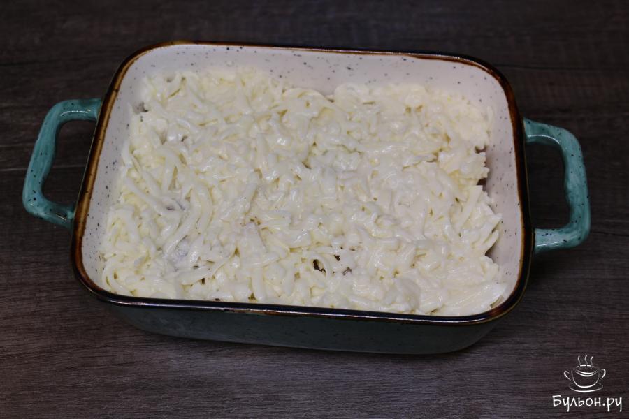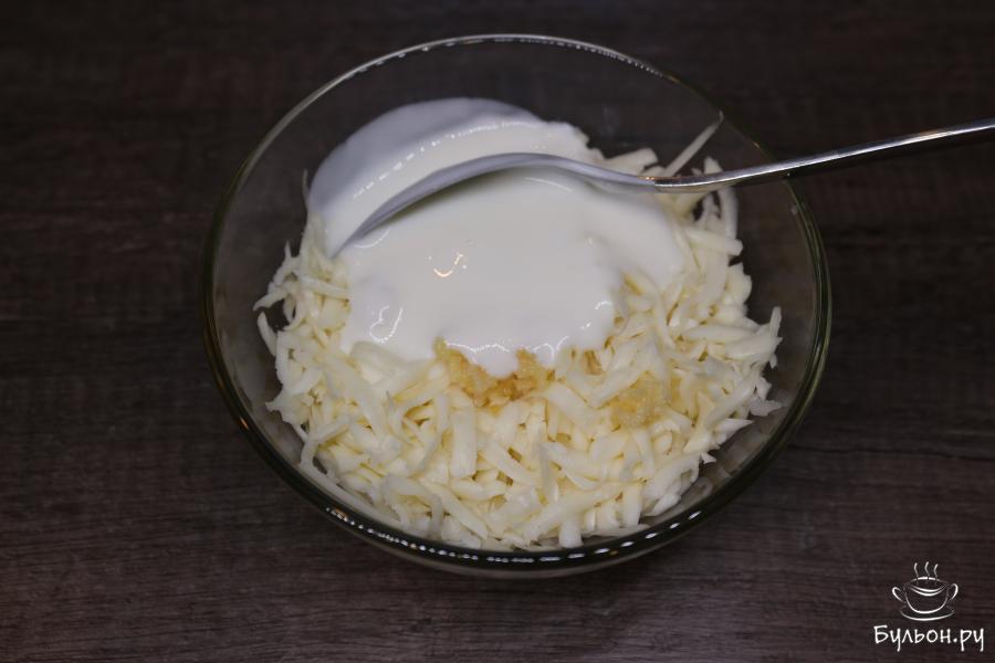 2. Моцареллу натрите на терке с крупными ячейками, выложите ее в емкость. Добавьте измельченный через пресс чеснок. Добавьте йогурт.