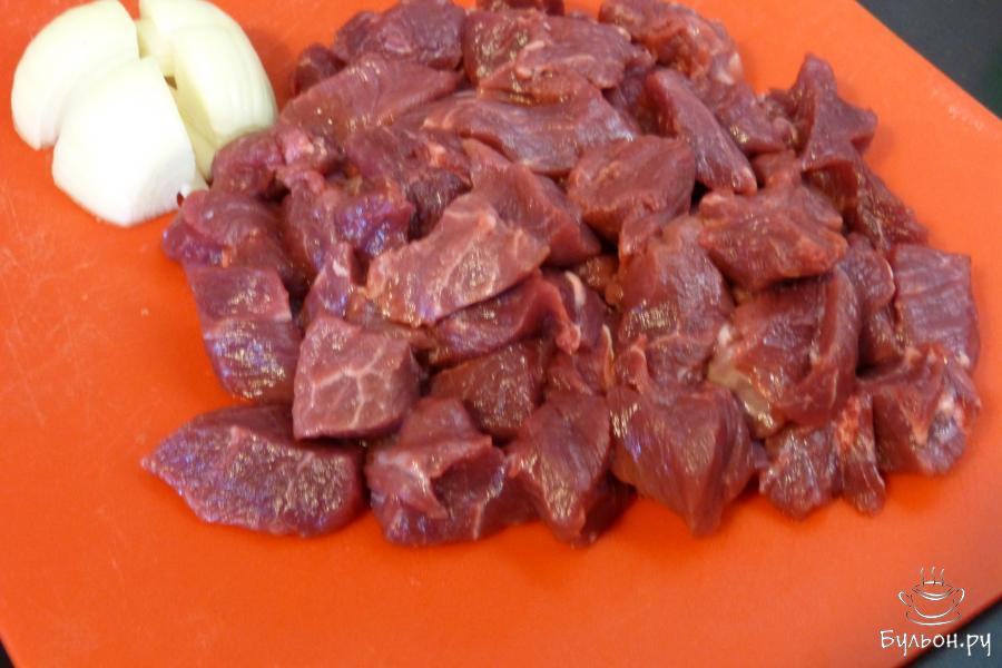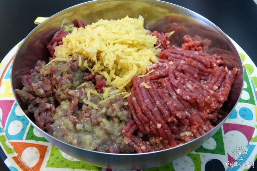 1. Взять лопаточную часть мяса, помыть, порезать на кусочки. Лук почистить, разрезать на несколько частей. Все прокрутить через мясорубку в глубокую миску.