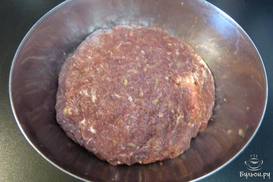 3. Добавить соль, перец, воду и перемешать. Добавлять воду нужно в магазинное мясо. Если мясо домашнее, свежее, в нем есть свой сок, то воды добавлять не надо. Фарш хорошо выбить, чтобы получилось однородная масса.