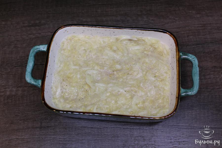 4. Все перемешайте и выложите в жаропрочную форму, предварительно смазанную маслом. Запекайте кабачковую массу в духовке при температуре 225 градусов в течение 25 минут.