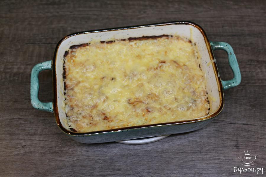 6. Через 25 минут посыпьте запеканку этим сыром. Отправьте форму обратно в духовку еще на 7 минут, но уменьшите температуру уже до 125 градусов. Запеканка из кабачков готова.
