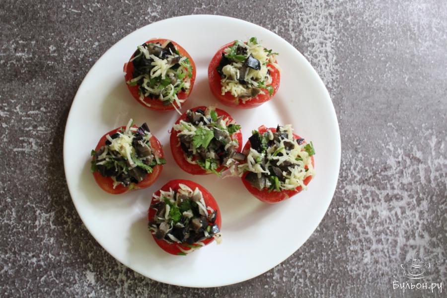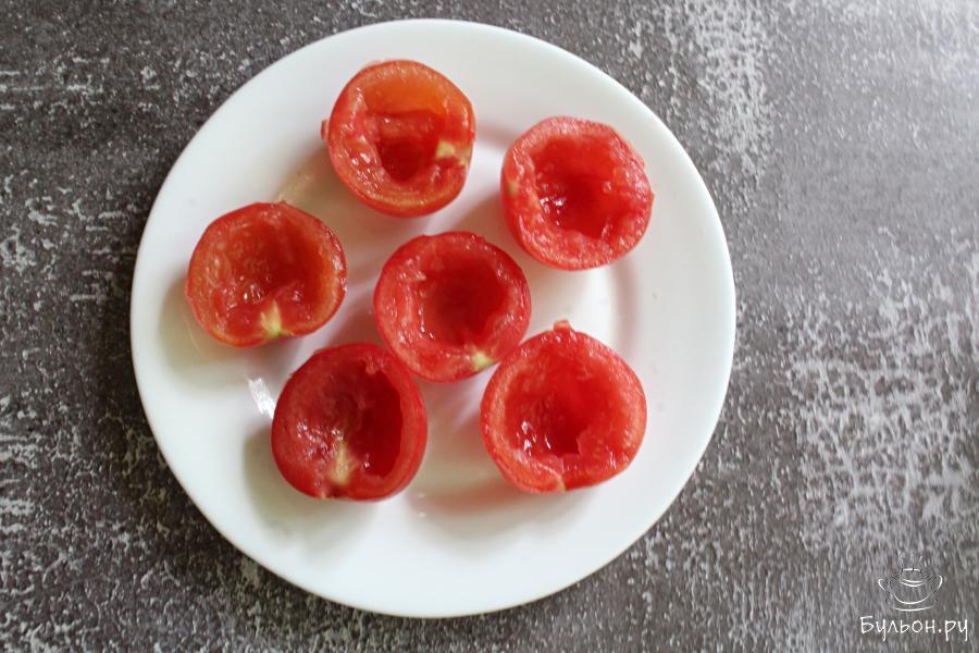 6. Небольшие помидоры промыть, обсушить и разрезать пополам. Аккуратно, при помощи ножа или ложки, убрать мякоть из помидор.