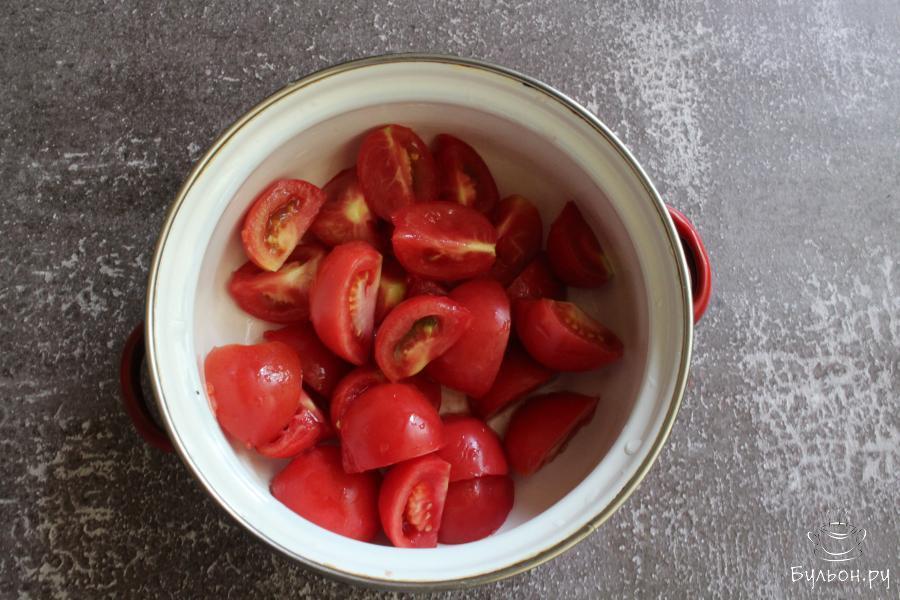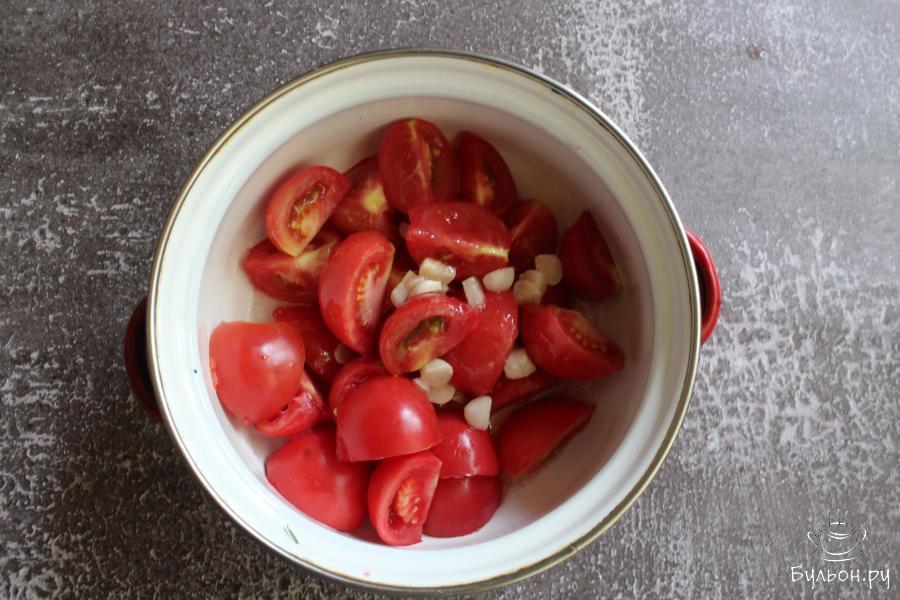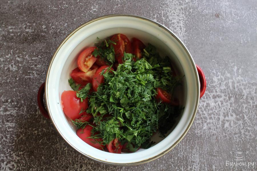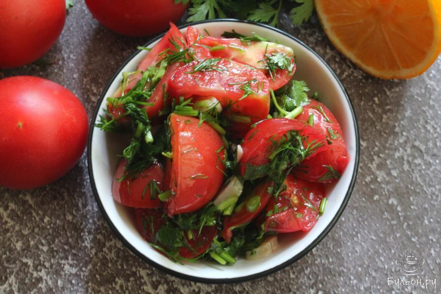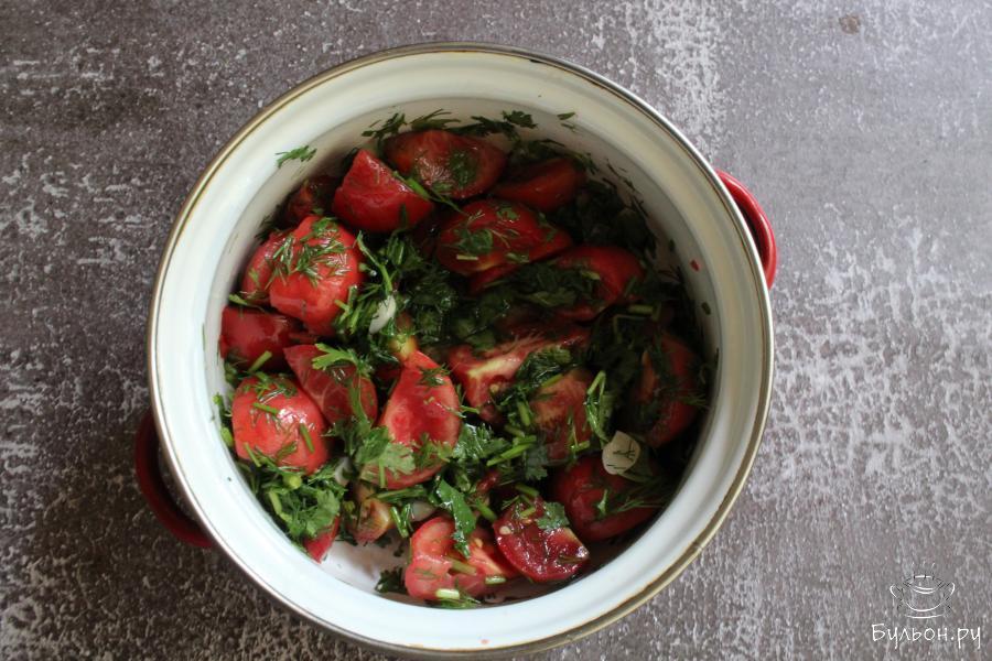 Быстрые маринованные помидоры с зеленью - замечательно подойду к обеду, ужину или можно приготовить такую закуску к шашлыкам на природе. Готовится закуска быстро. Даже если вы не хотите ждать, чтобы помидоры настаивались около часа, их можно подать к столу сразу, они будут вкусные в любом варианте. Если вы любите острые овощные закуски, то мелко нарежьте острый перец и добавьте его на сковороду в одно время с чесноком. Эти маринованные помидоры порадуют вас своим ароматом и сочностью.