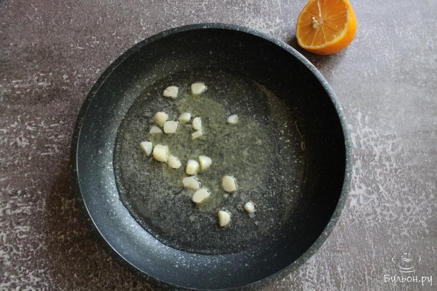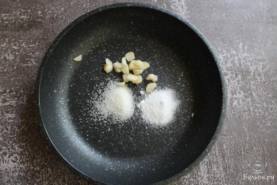 2. На сковороду выложить соль, сахар, мелко нарезанный чеснок. Добавить масло и перемешать. Поставить сковороду на огонь и прогреть чеснок несколько минут.