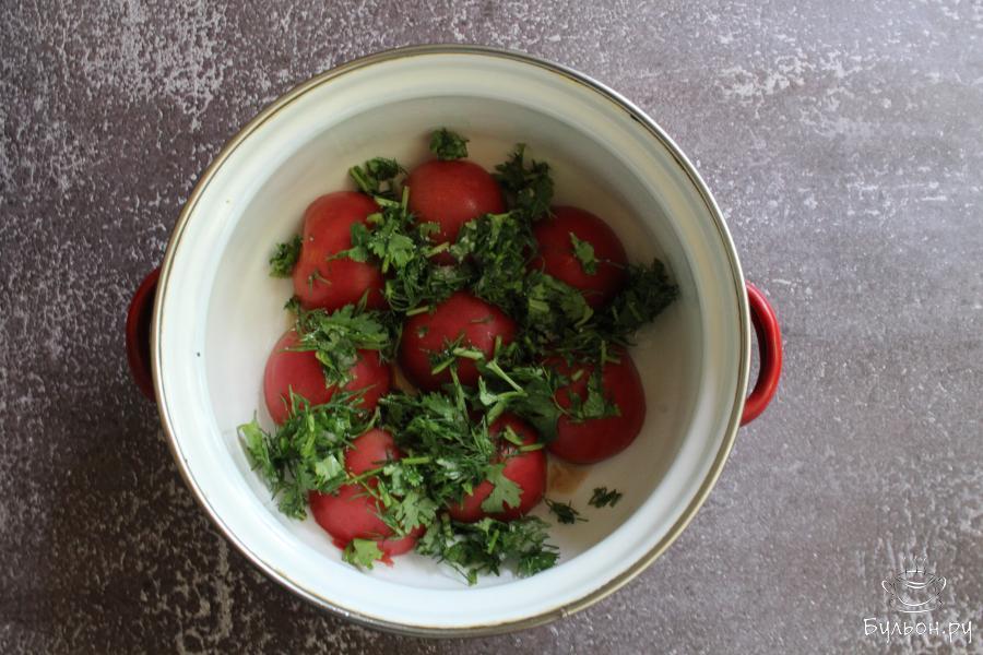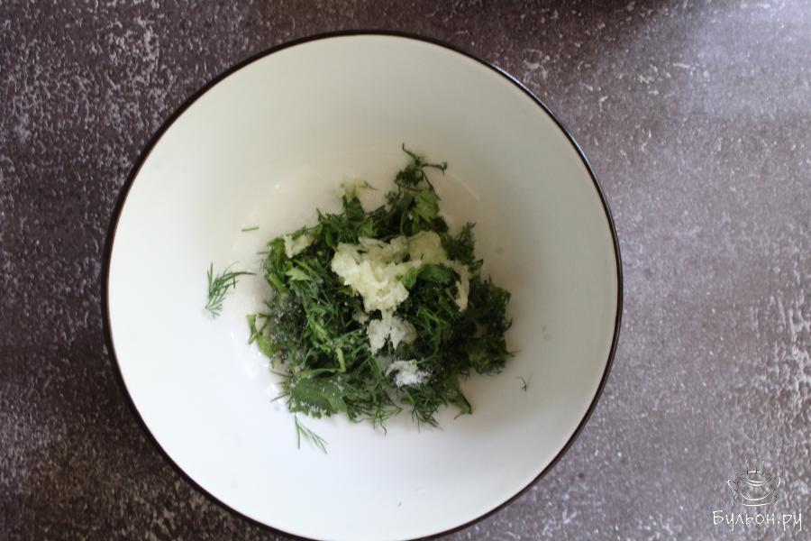 3. Зелень промыть и обсушить, чеснок почистить. Пучок кинзы и пучок укропа нарезать мелко. Чеснок продавить через пресс. Добавить часть соли и перемешать.