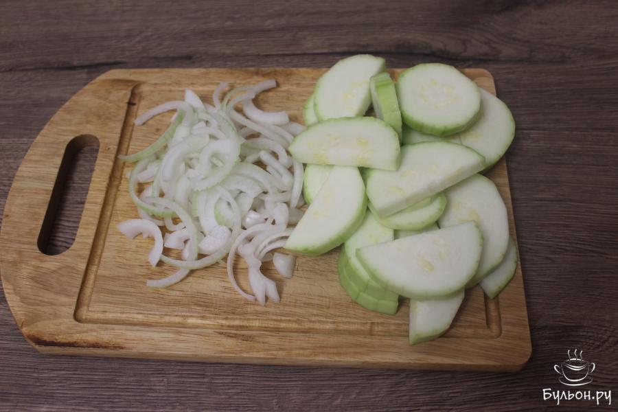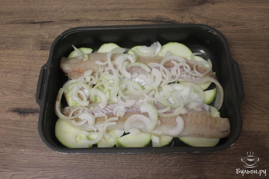 3. Форму для запекания слегка смажьте растительным маслом. В нее выложите половинки кабачка, затем выложите рыбу, слегка присолите, сверху выложите полукольца лука.