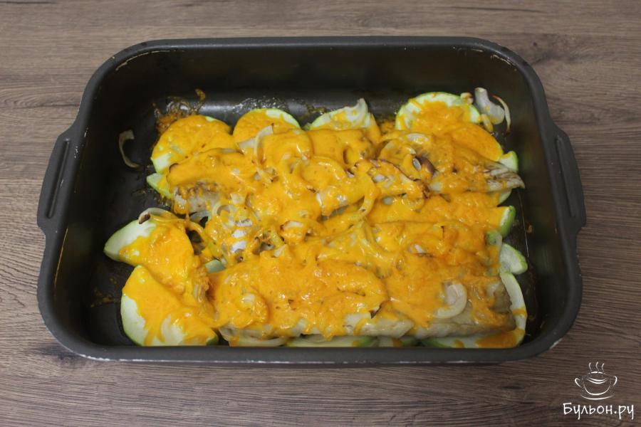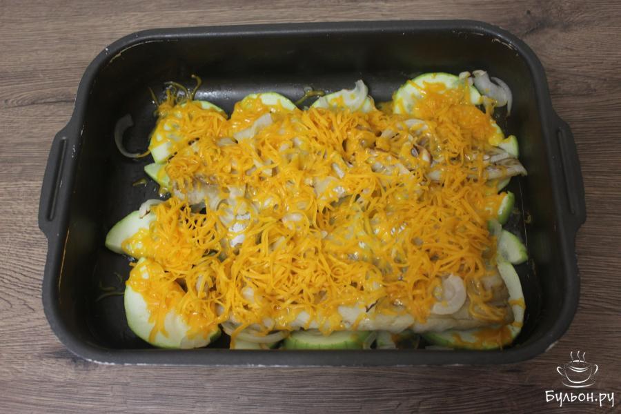 4. Поставьте форму с рыбой запекаться, в разогретую до 180 градусов духовку, на 15 минут. После чего достаньте форму, присыпьте сверху натертым сыром и снова отправьте в духовку еще на 7-10 минут.