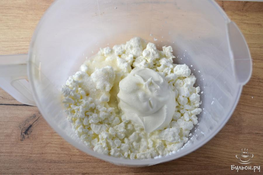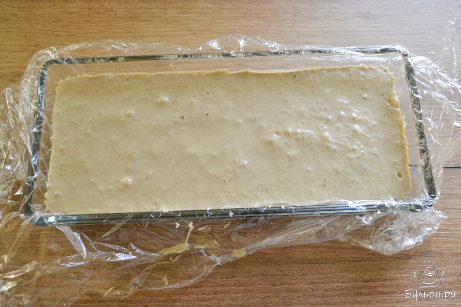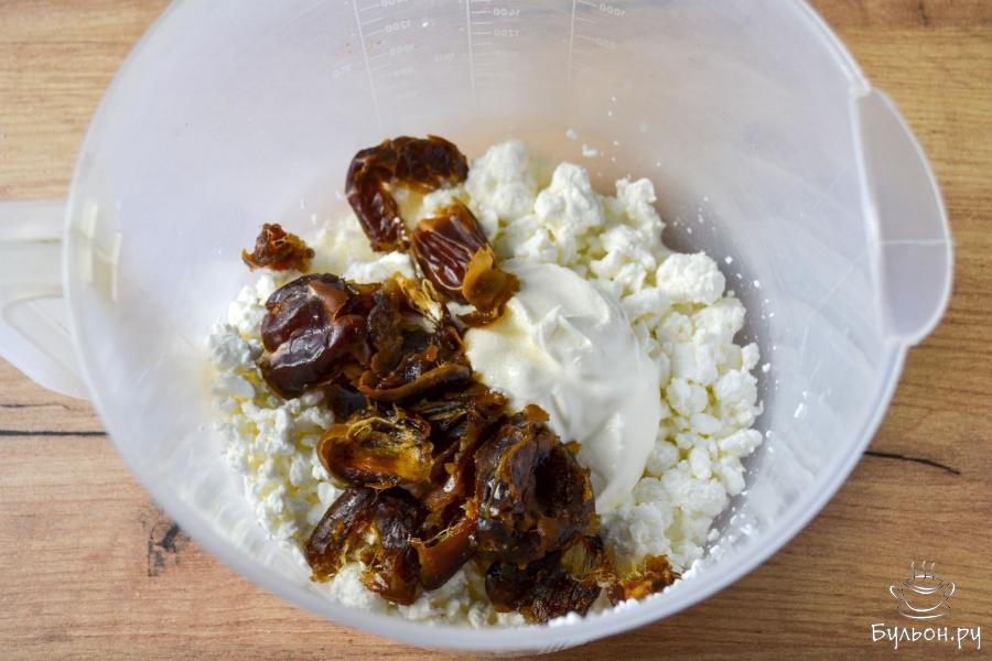 8. Невысокую форму застелите пищевой пленкой и вылейте творожно-финиковую массу толщиной примерно 2-3 см. и поставьте в холодильник для стабилизации.