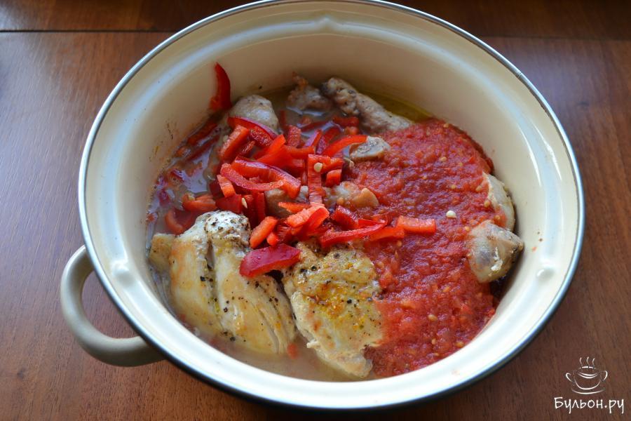 9. Затем добавить к курице порезанный сладкий болгарский перец и предварительно перетертые свежие помидоры. Помидоры можно порезать, удалив кожицу. Все перемешать и тушить далее еще 20 минут.
