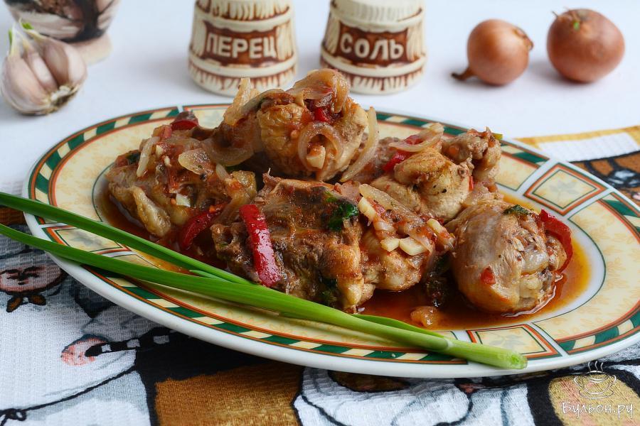 Хочу предложить вам рецепт невероятно вкусного блюда из грузинской кухни - чахохбили. В давние времена блюдо готовилось из фазана, сейчас - из курицы. Особенность приготовления чахохбили - очень много лука и специй, сухое вино и томаты, а также, предварительное сухое обжаривание курицы. Блюдо получается необычайно нежным, пряным и ароматным. Чахохбили можно сделать острым, что присуще грузинским блюдам, но если кто не любит, и без перца получится отлично.