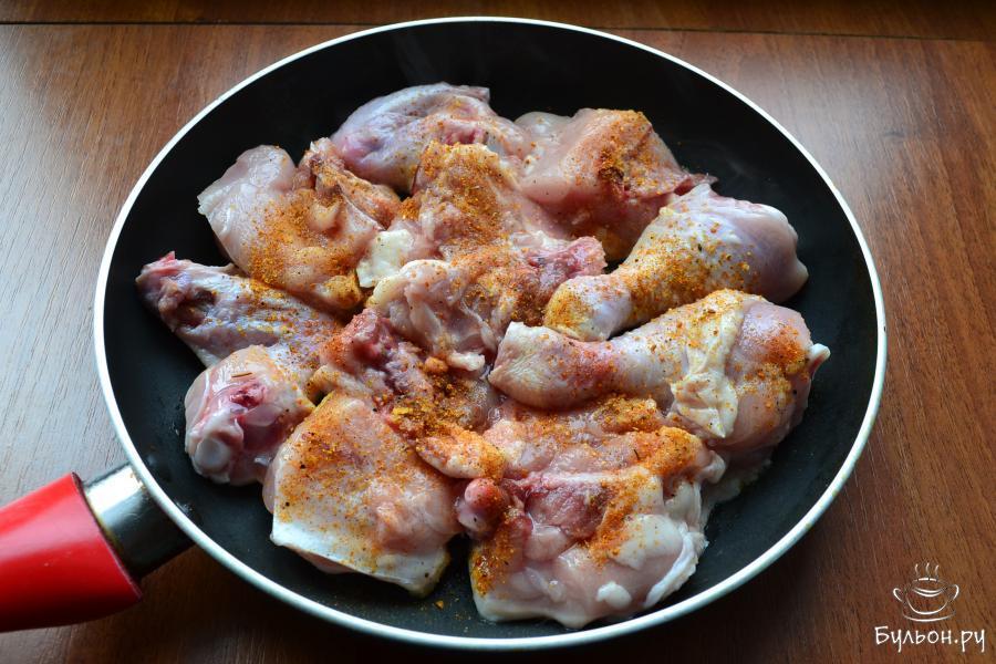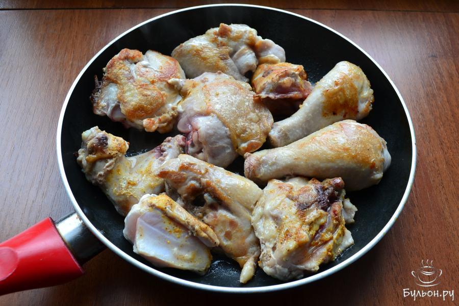 4. Обжаривать мясо на довольно сильном огне до румяной корочки со всех сторон. Курицу посолить и переложить ее в кастрюлю.