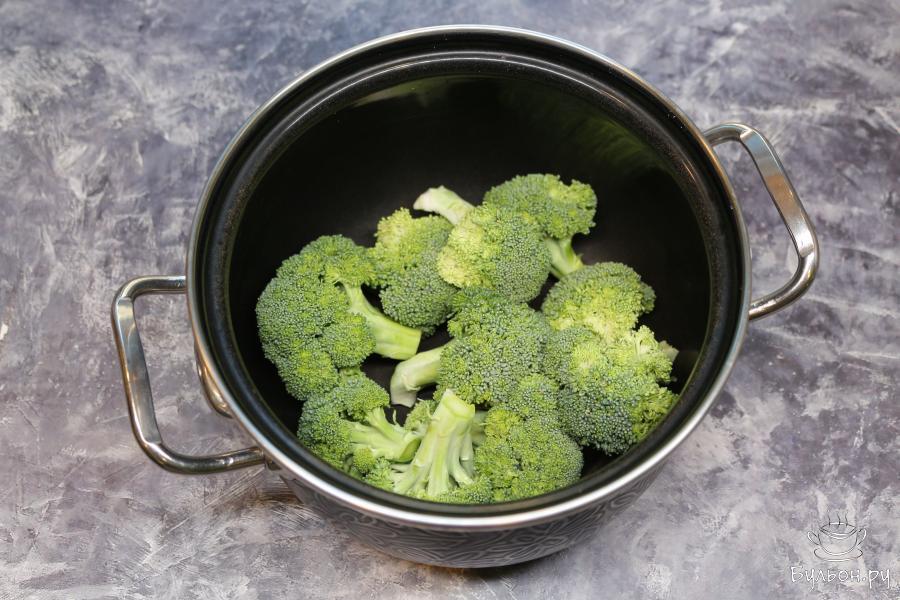 1. Брокколи разберите на соцветия, положите в кастрюлю, залейте водой и поставьте на огонь. Как только закипит вода, проварите их в течение 7 минут.