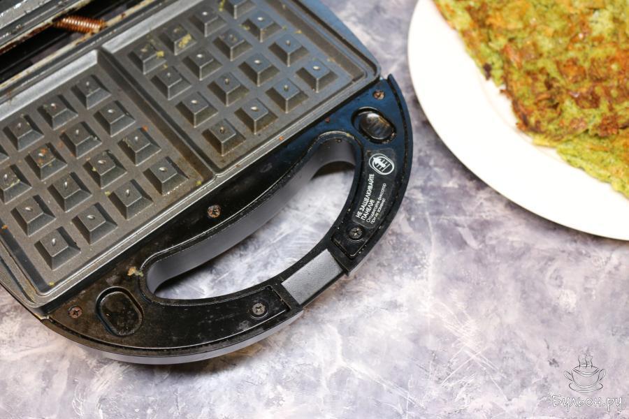 5. Панели вафельницы смажьте небольшим количеством растительного масла. Тонким слоем выложите подготовленную массу.