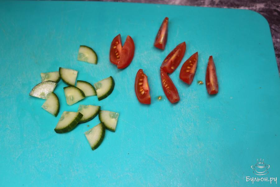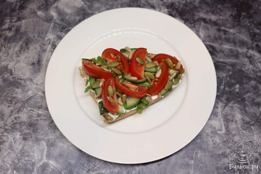 5. Сверху на бутерброд выложите рукколу, огурцы и помидоры. Сверху посыпьте семенами тыквы и подсолнуха.