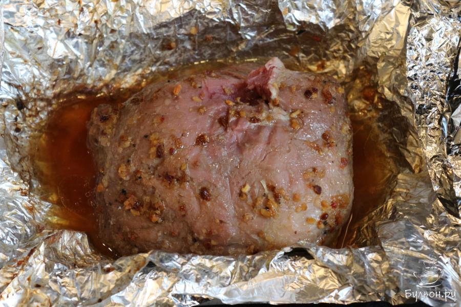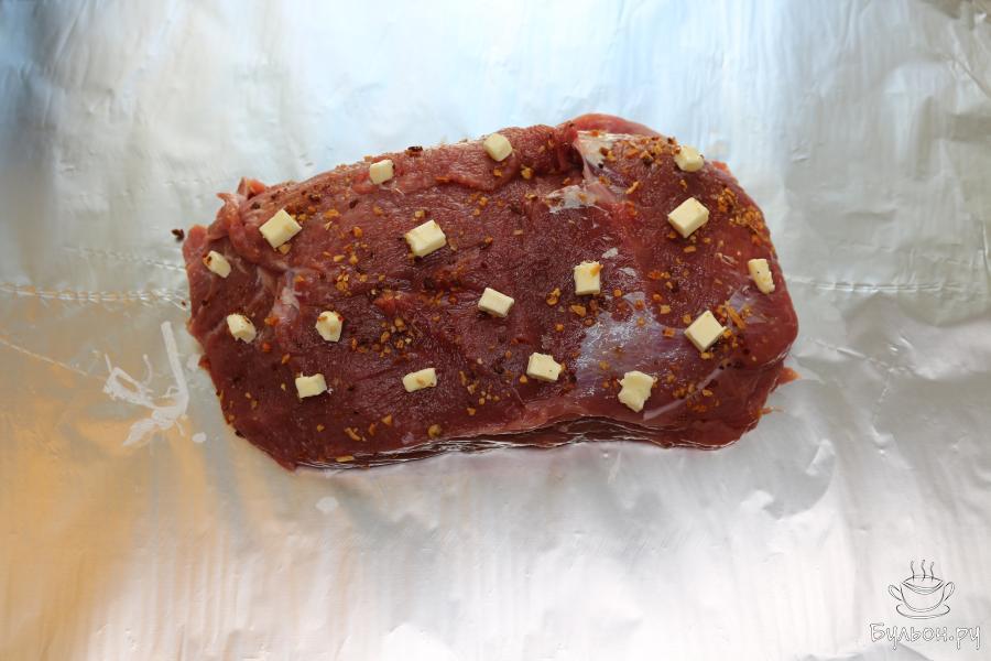 2. Затем выложите на фольгу кусочки масла, потом кусок мяса, и оставшееся масло. Закройте все плотно фольгой. Сделайте двойной слой фольги для прочности.