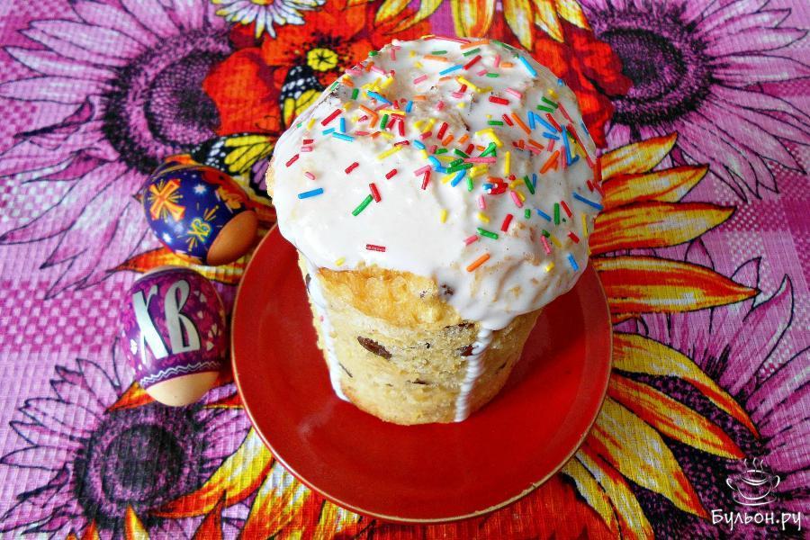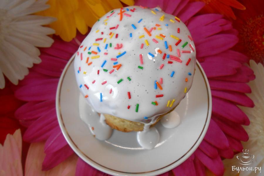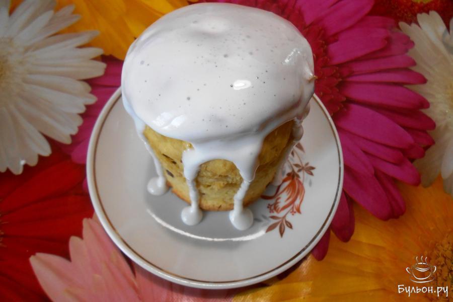 18. Для глазури один охлажденный белок взбить с одной щепоткой каменной соли в пенку, добавляя сахарную пудру, взбиваем около 15 минут. Остывшие куличи смазать сахарной глазурью.