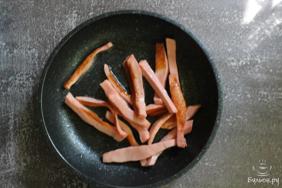 1. На сковороде разогреть масло. Колбасу нарезать длинными полосками и обжарить колбасу до румяного цвета со всех сторон. Убрать колбасу со сковороды.