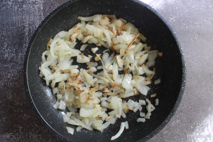 2. Лук и баклажан почистить, овощи промыть. Крупную луковицу мелко нарезать и обжарить, до мягкости, на том же масле, где жарилась колбаса.
