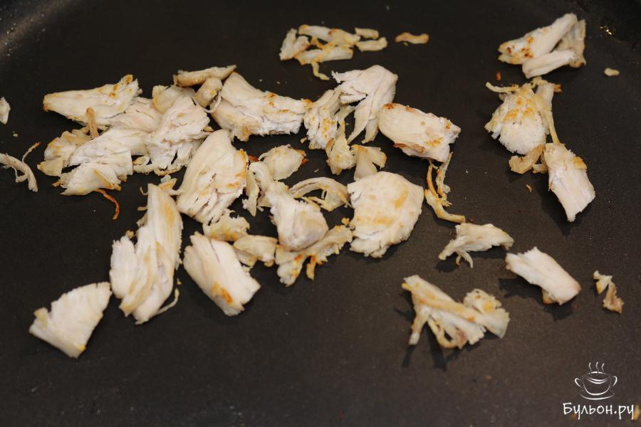 2. В течение 50 минут варите в подсоленой воде куриное филе, затем нарежьте его на кусочки и обжарьте почти на сухой сковороде, лишь чуточку смазав ее тонким слоем сливочного масла.