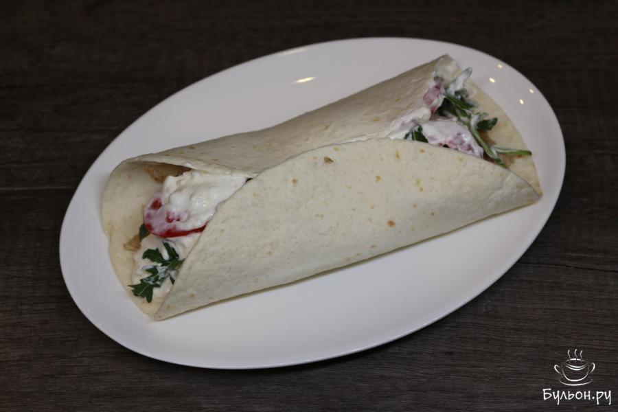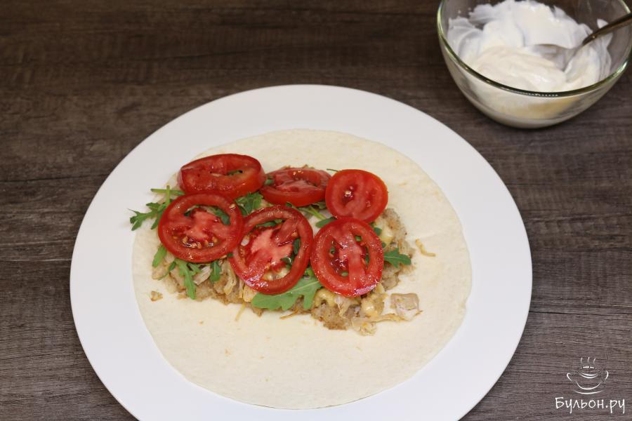 6. Затем выложите курицу, рукколу и нарезанные на кружочки помидоры. Сверху смажьте все приготовленным соусом.