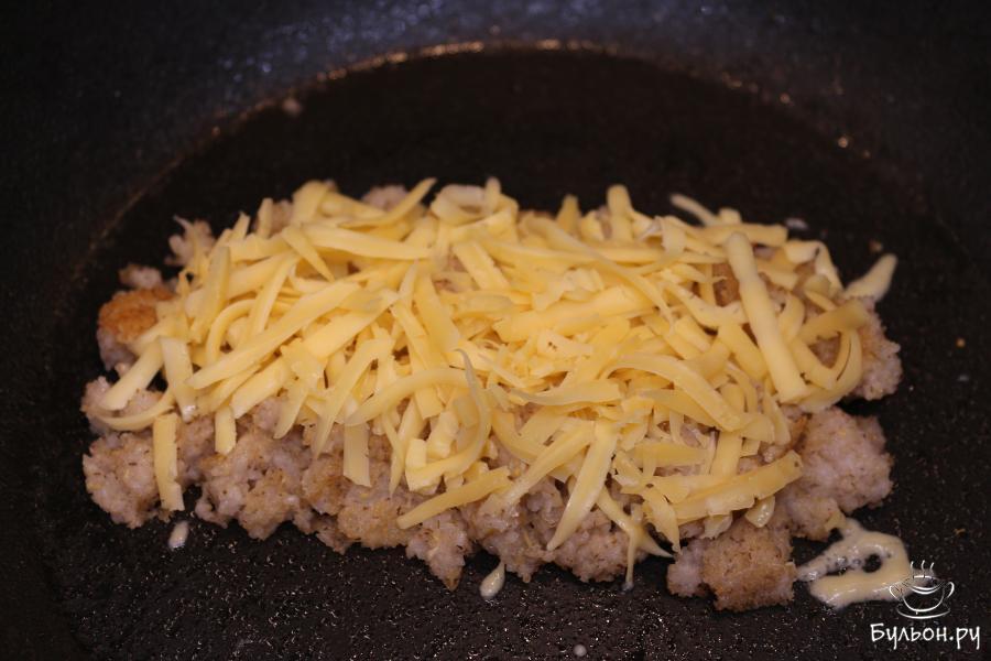 4. Растопите сливочное масло на сковороде. Выложите кашу, периодически перемешивая ее. Кашу жарьте до тех пор, пока на ней уже не образуется хрустящая корочка. Затем выложите на нее тертый сыр, уменьшите огонь и под крышкой расплавьте сыр.