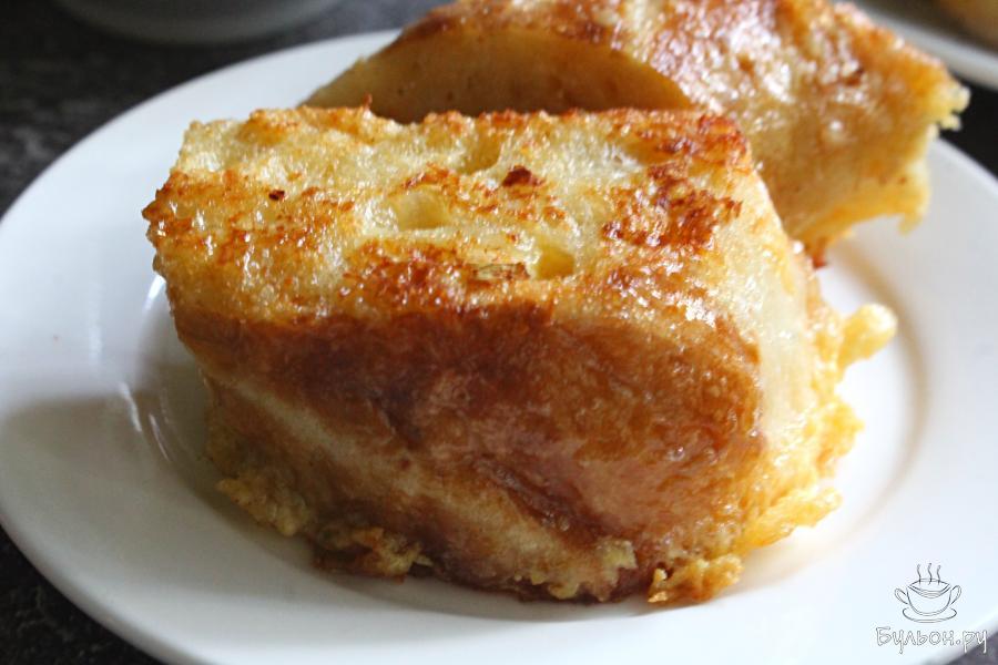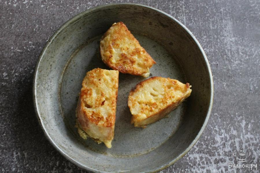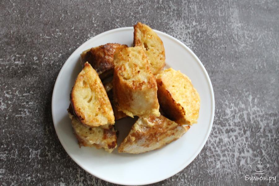 4. Хлеб нарезать не очень мелкими кусочками, выложить хлеб в чашку с яичной массой. Хлеб переворачивать, чтобы он пропитался яично-сырной смесью.