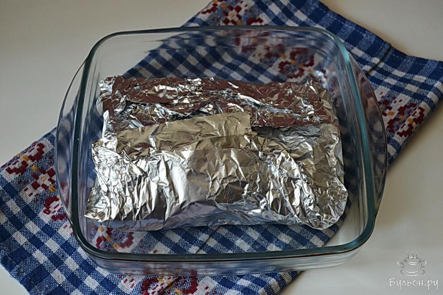 5. Герметично завернуть мясо, закрывая фольгой сначала с боков, а затем по вертикали. Положить в форму для запекания, на дно налить стакан воды. Запекать примерно 80 минут на среднем огне.