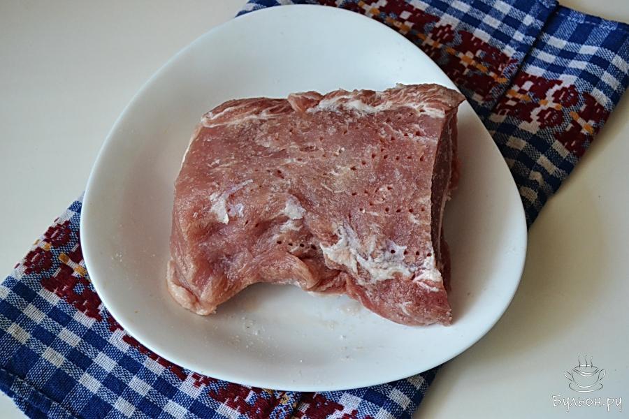 2. Свиную корейку промыть, обсушить. Я обрезаю лишние кусочки мяса, которые могут присутствовать вокруг цельного пласта. Посолить и поперчить. Я сделала в мясе проколы вилкой, пока мясо было еще примороженным, чтобы маринад и соль проникали внутрь.