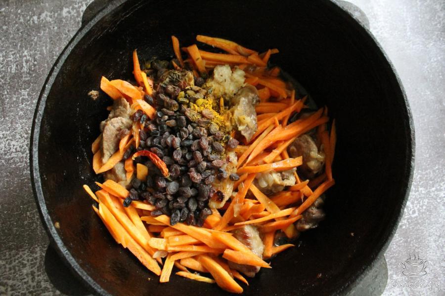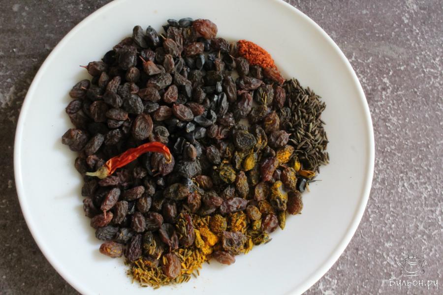 7. Подготовить изюм, зиру, барбарис, целый перец чили, куркуму, молотый острый или не острый красный перец.