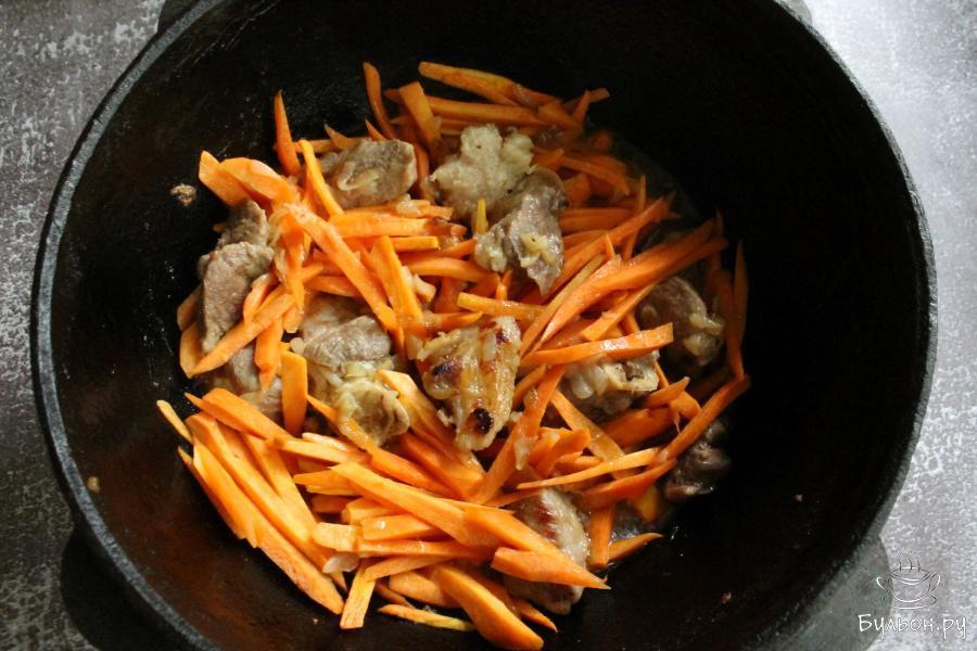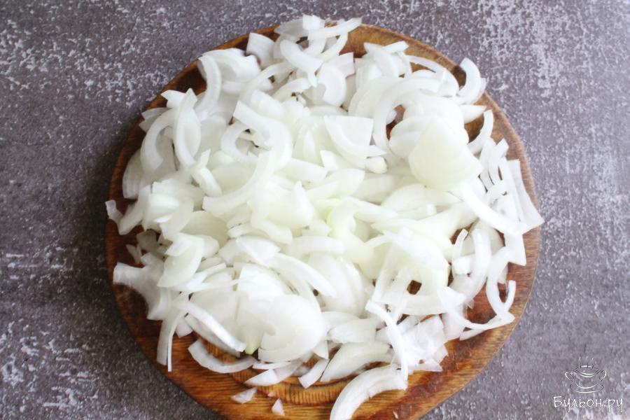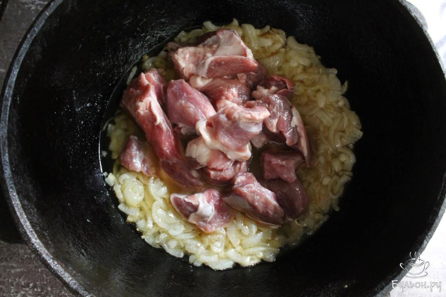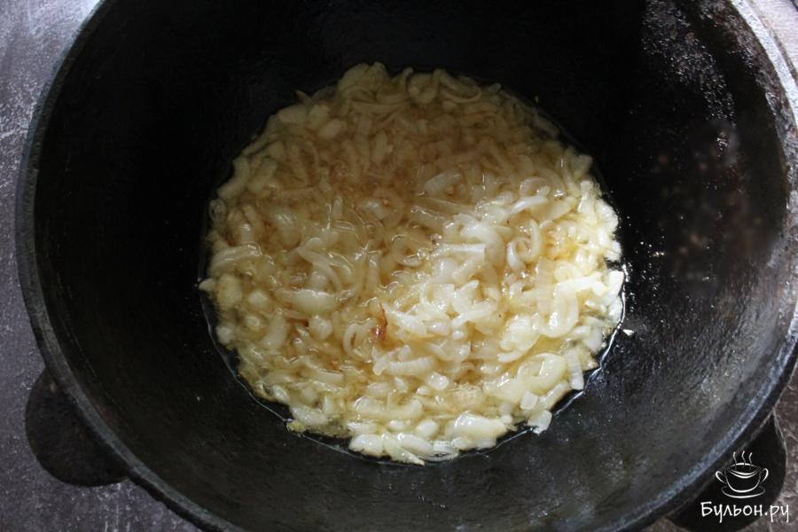 4. В казане сильно разогреть масло и выложить лук. Готовить на сильном огне. Обжарить лук до золотистого цвета. Помешивать.