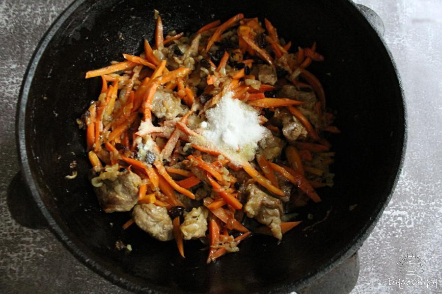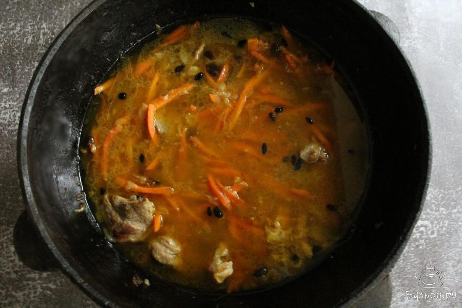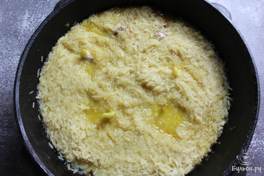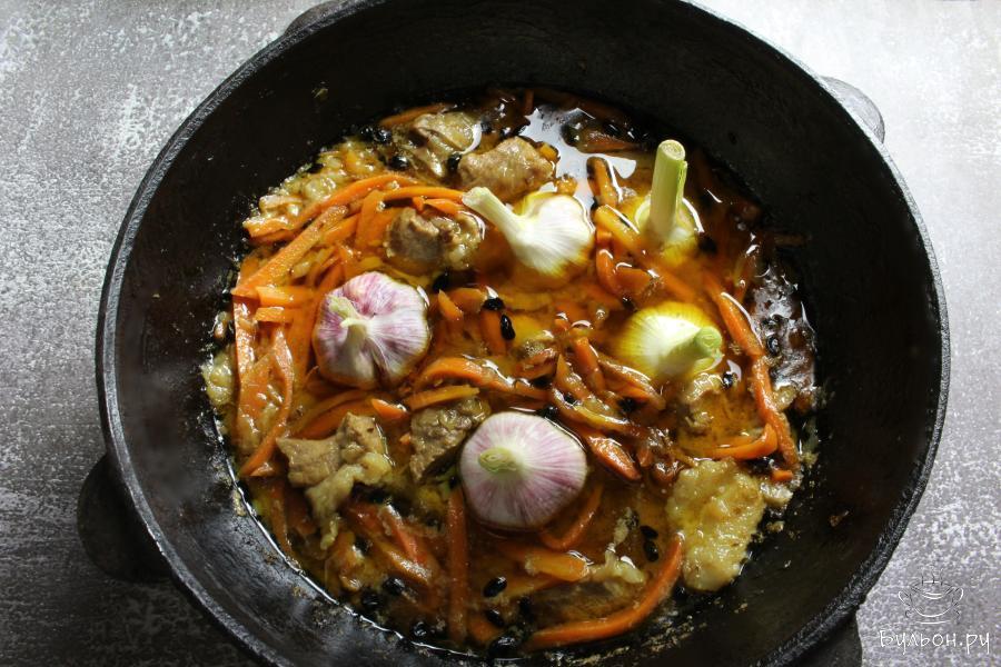 13. Головки чеснока достать. Попробовать зирвак, он должен быть немного пересолен. Если соли не хватает, то добавить. Рис промыть, выложить его в казан. Чеснок выложить обратно, углубить его в рис. Если воды в зирваке осталось мало, то долить так, чтобы она была немного выше риса.