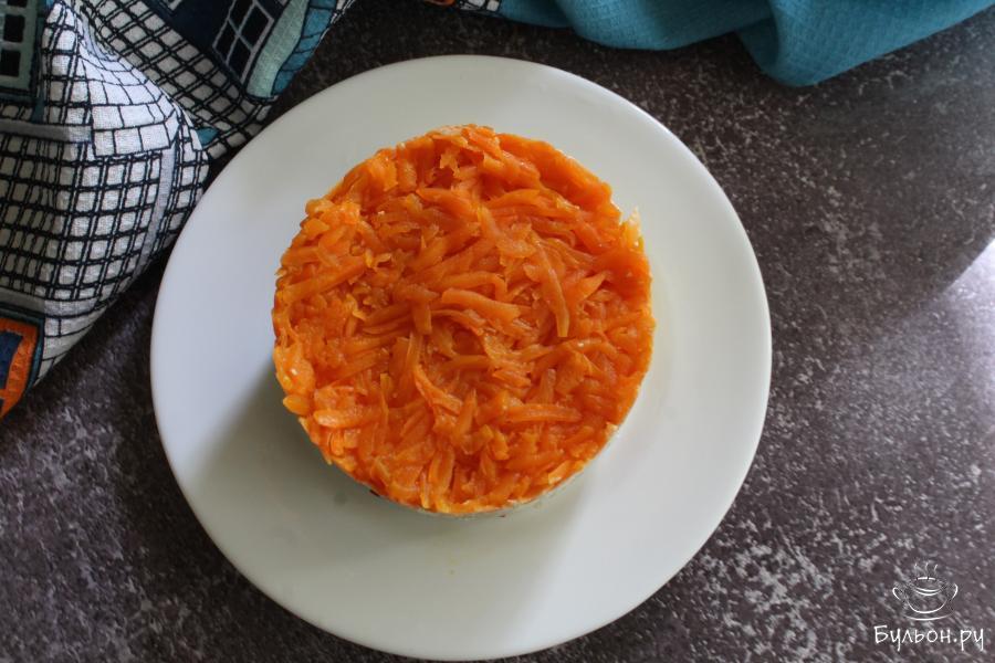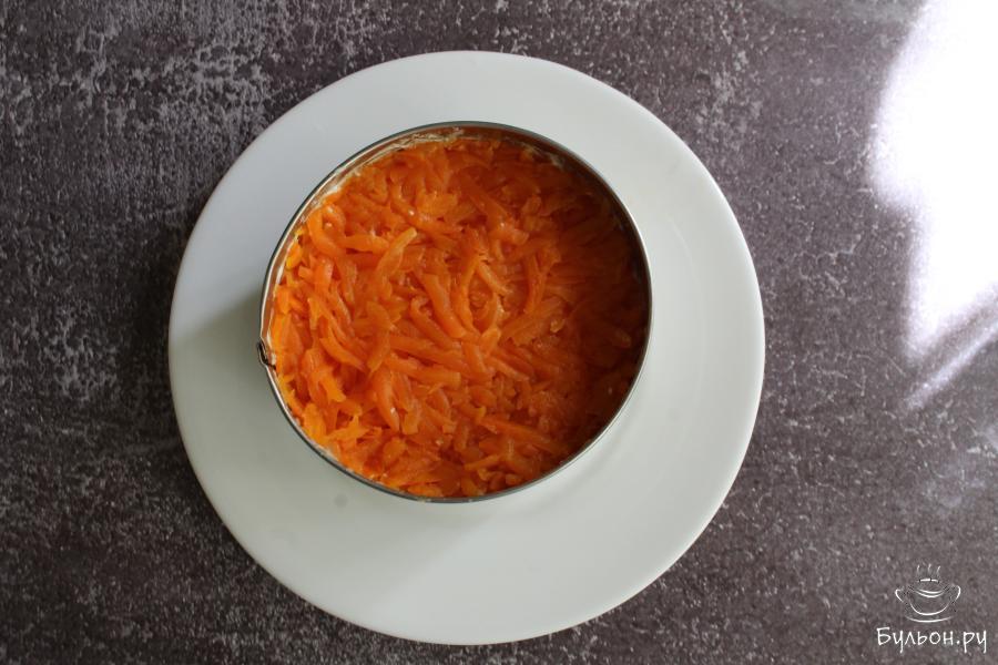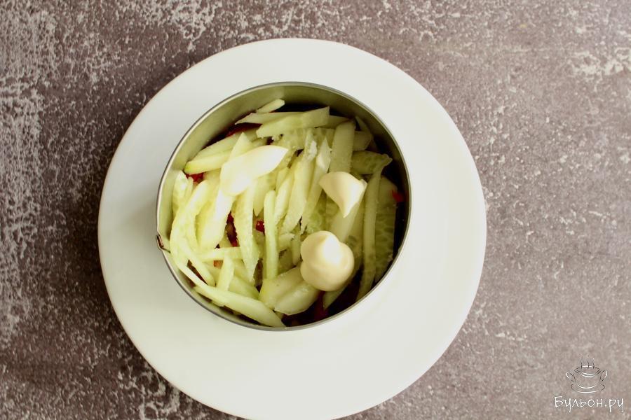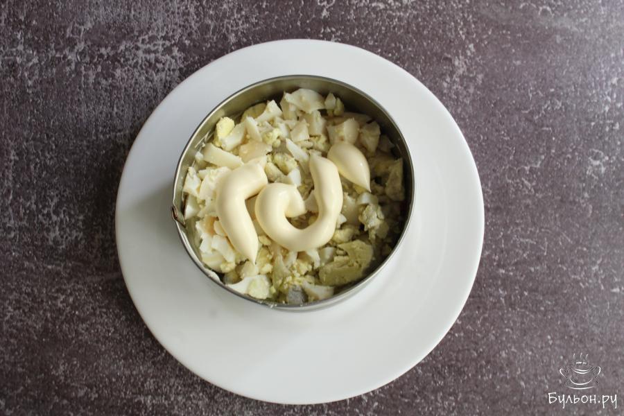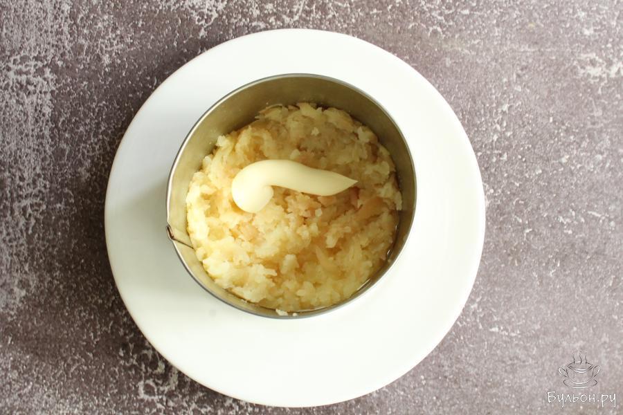 2. Картошку натереть на крупной терке и выложить первым слоем в кулинарное кольцо. Смазать слой майонезом. Все слои этого салата можно по вкусу солить.