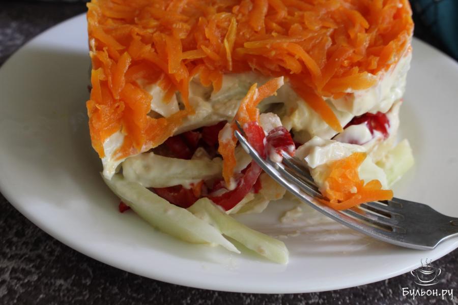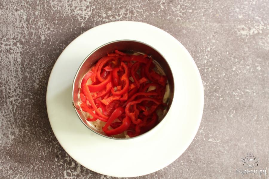 3. Красный болгарский перец почистить, промыть и обсушить. Нарезать перец тонкими полосками и выложить следующим слоем.