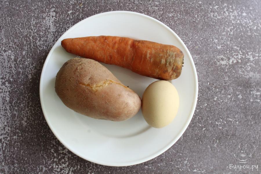 1. Крупную картошку и морковь промыть и сварить в шкурке до готовности. Яйцо сварить вкрутую, остудить, почистить яйцо и овощи.