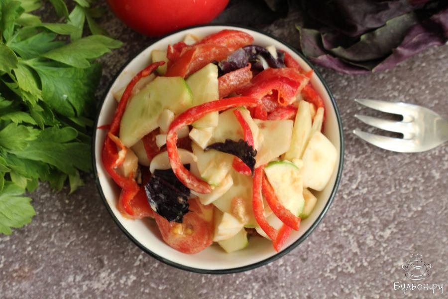 Салат с красными перцами, овощами и яйцом можно приготовить очень быстро. Такой салат получается сочный, яркий, вкусный и полезный. Чтобы салат был сочный, выбирайте овощи спелые, свежие, мясистые. Этот салат разнообразит ваше повседневное меню и его вкус понравится многим. Если под рукой нет бальзамического соуса, то такой салат вполне можно заправить растительным, душистым маслом и лимонным соком. Все варианты будут аппетитные.