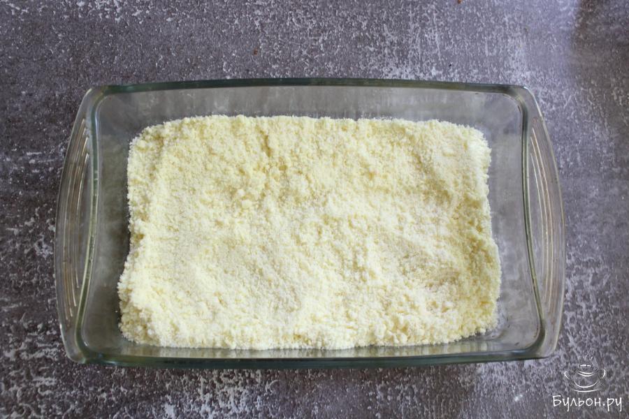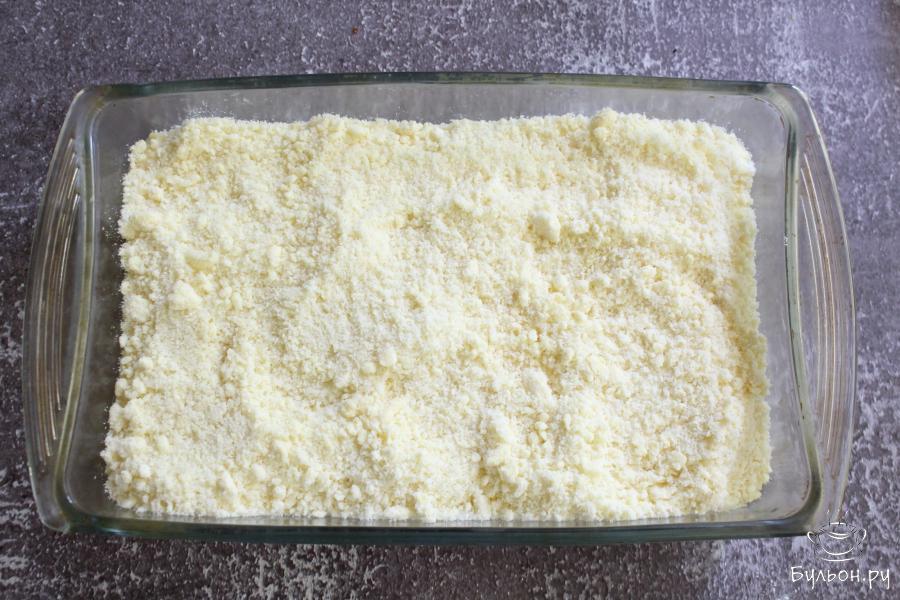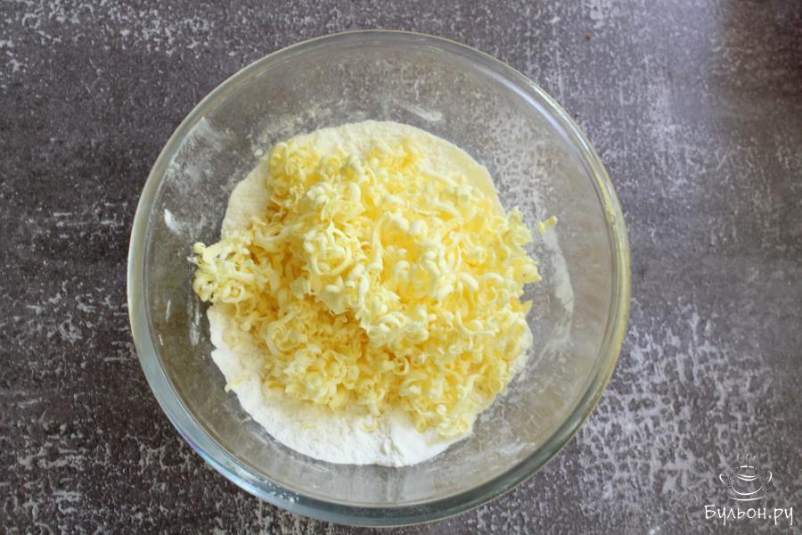 4. Холодное масло натереть через крупную терку в чашку с мукой и хорошо растереть, чтобы получилась крошка.