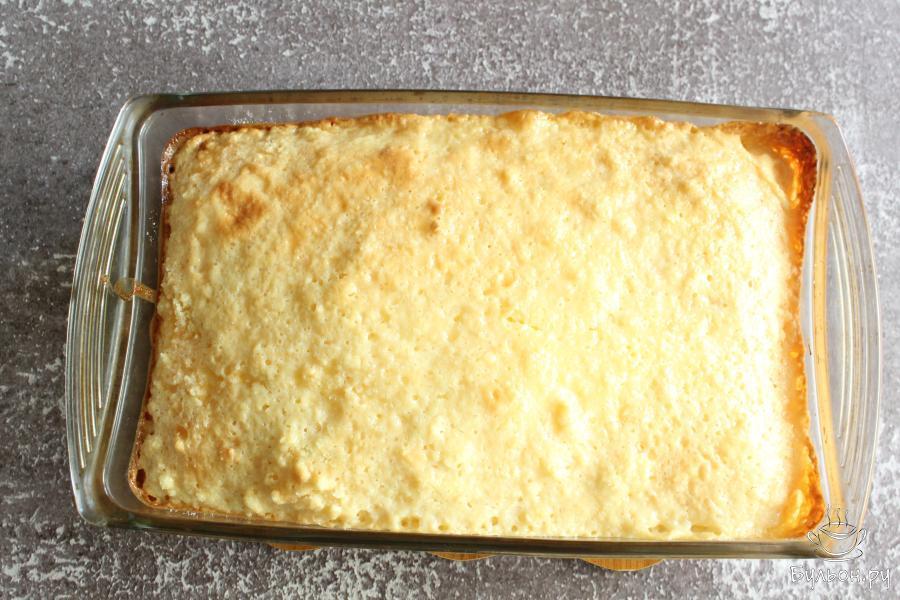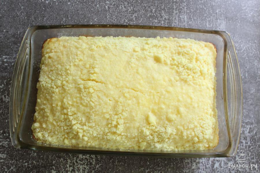 9. Затем форму достать и залить пирог сгущенкой. Если сгущенка густая, то можно немного развести ее молоком.