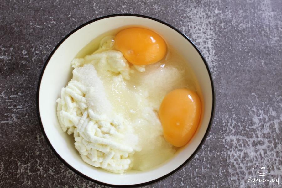 1. Для начинки: творог перекрутить через мясорубку, добавить яйца, 75 грамм сахара (от общего количества) и ванильный сахар. Хорошо размешать и отставить.