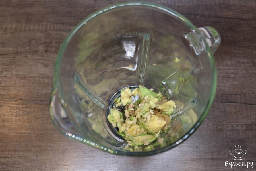 2. Переложите авокадо и чеснок в чашу блендера, влейте воду и измельчите в течение минуты, для того чтобы масса приобрела однородность.