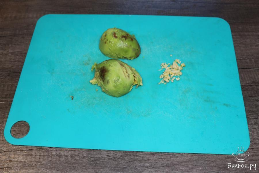 1. В первую очередь очистите авокадо. Разрежьте его пополам, удалите косточку, ложкой извлеките мякоть авокадо. Чеснок нарежьте на кусочки.