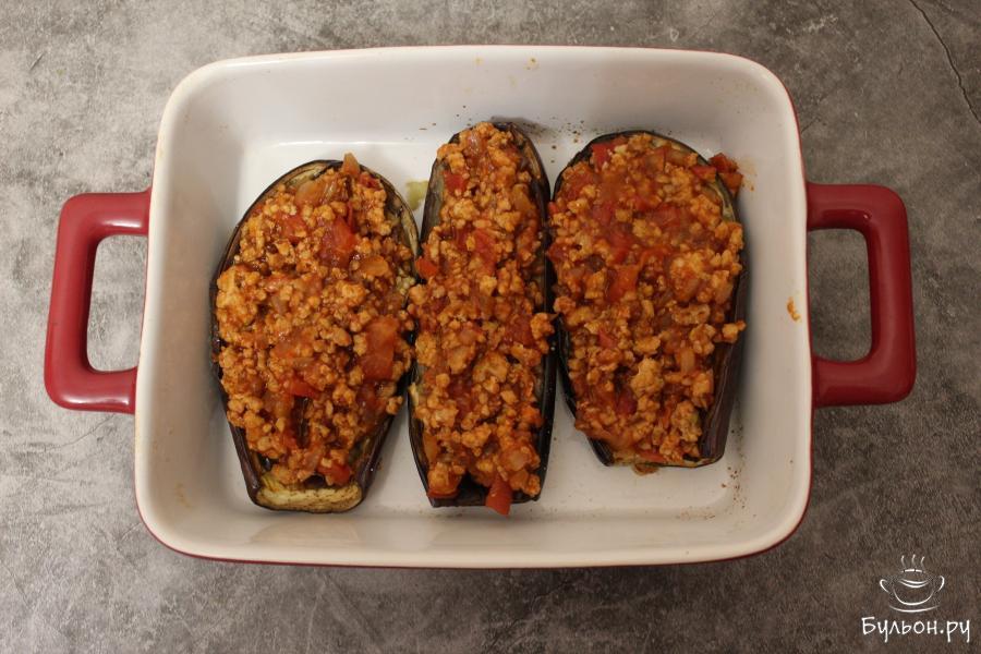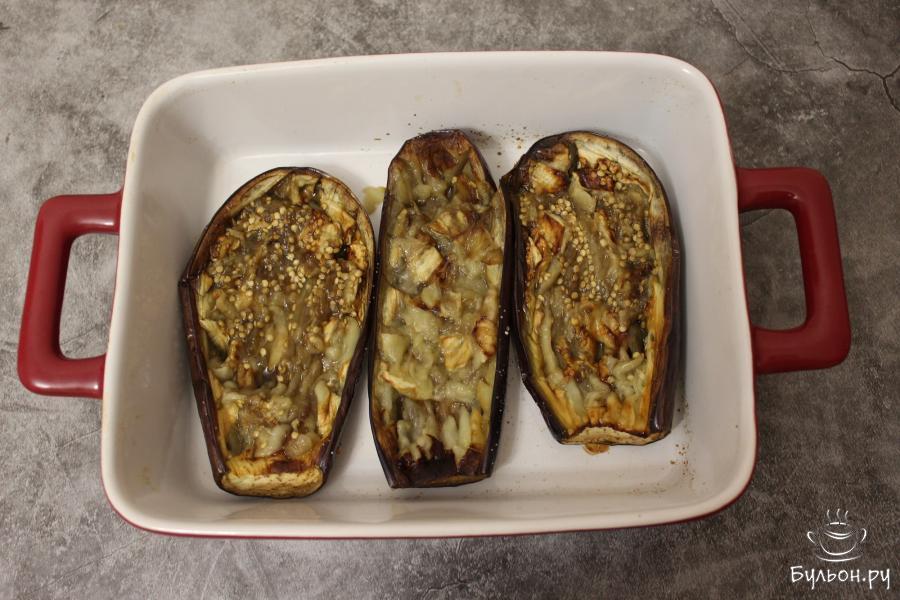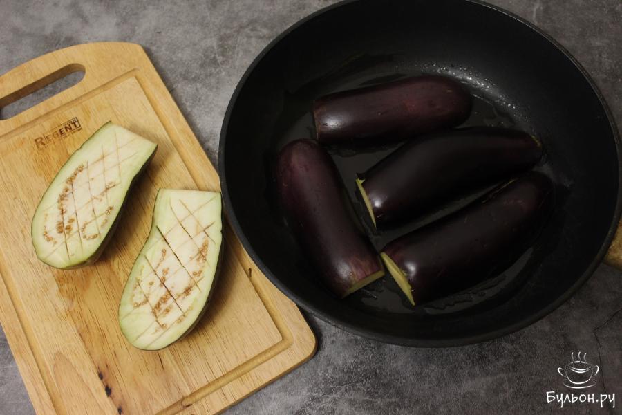 1. У баклажанов срежьте плодоножку и разрежьте их вдоль пополам. Мякоть баклажана надсеките с помощью ножа, подсолите. Выложите баклажаны на сковороду мякотью вниз и слегка обжарьте на оливковом масле. Затем выложите в форму для запекания и запекайте при 200 градусах 30 минут.