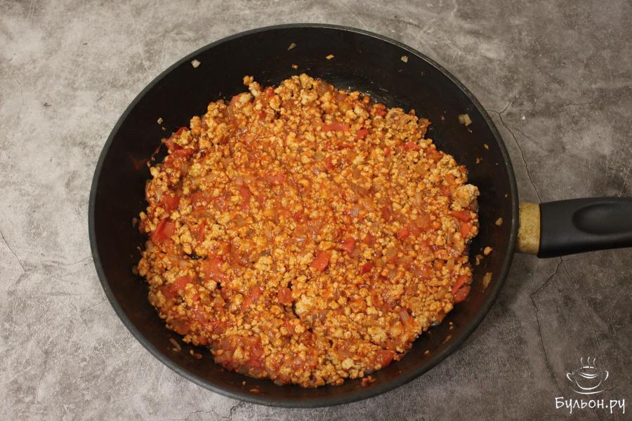 2. Приготовьте начинку. Слегка обжарьте фарш на оливковом масле, затем добавьте нарезанный кубиками лук и еще немного обжарьте. Следом добавьте кубики помидора, жарьте. В конце добавьте томатную пасту, соль и еще немного обжарьте.