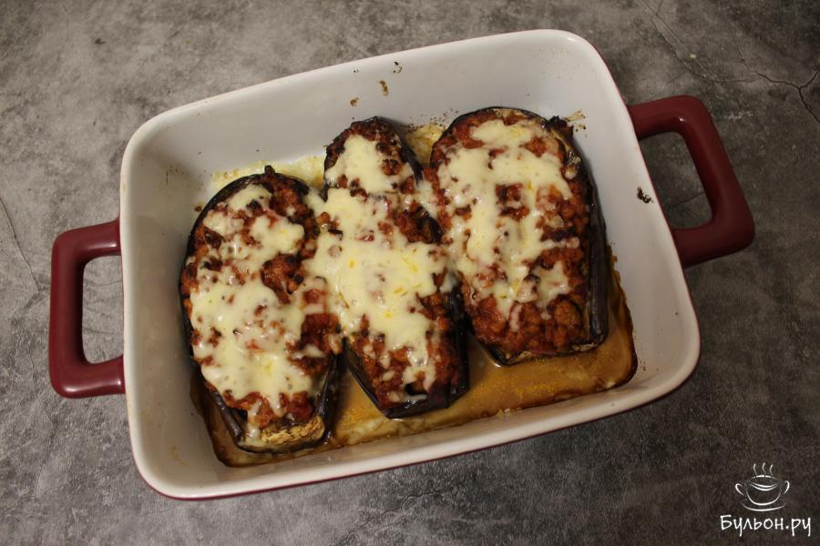 5. По истечении времени посыпьте запеченные баклажаны натертым сыром и запекайте в духовке до расплавления сыра. Подайте готовые баклажаны на стол в горячем виде.