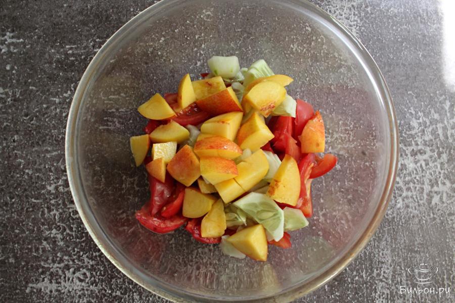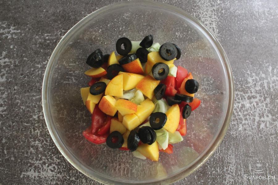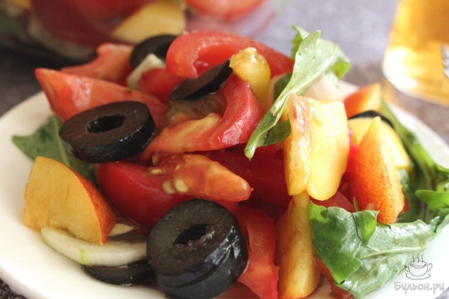 Этот овощной салат порадует всех любителей легких салатов с необычным сочетанием вкусов. Салат с помидорами, оливками и нектаринами получается очень сочный, полезный, яркий и ароматный. Нектарины для приготовления салата берите твердые и не сильно сладкие. Помидоры желательно брать твердые и сладкие. Салат готовится за считанные минуты и его можно сразу подавать, а можно немного охладить перед подачей. Салат подойдет для постного и вегетарианского меню.