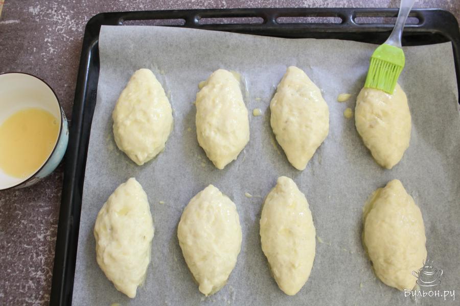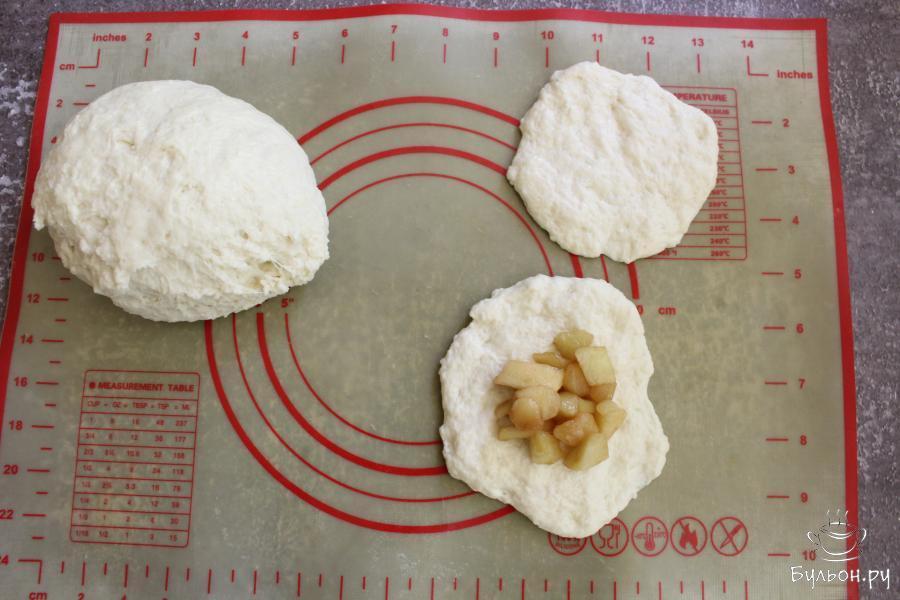 8. Разделить тесто на одинаковые кусочки. Каждый кусочек теста расплющить руками в лепешечку, разложить примерно по 2 ч. л. начинки на тесто.
