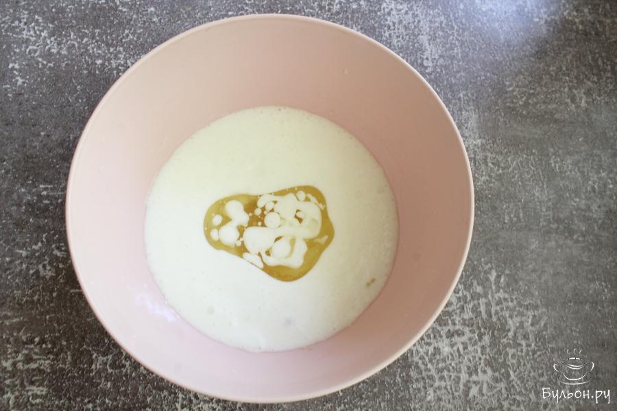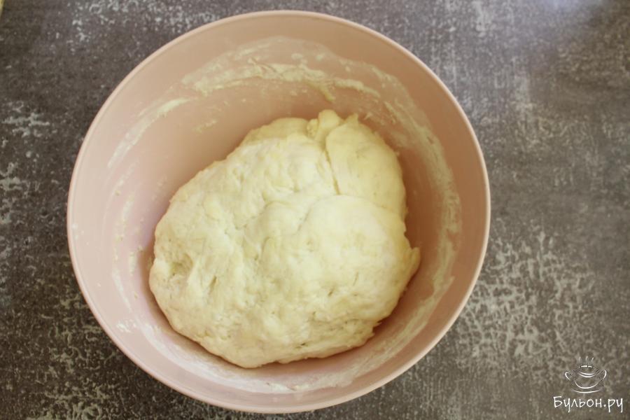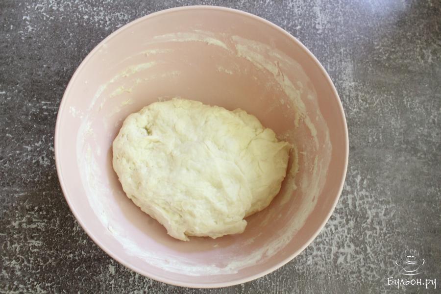 3. Добавить в чашку 2 стакана муки и замесить тесто. Если тесто липнет, то добавить оставшуюся муку. Оставить тесто на полчаса в тепле.