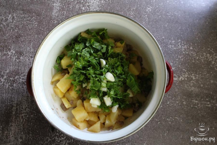 7. За 5 минут до готовности добавить мелко нарезанную зелень и не очень мелко нарезанный чеснок. Перемешать и доготовить блюдо.