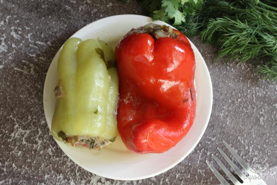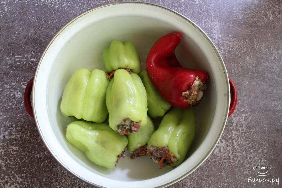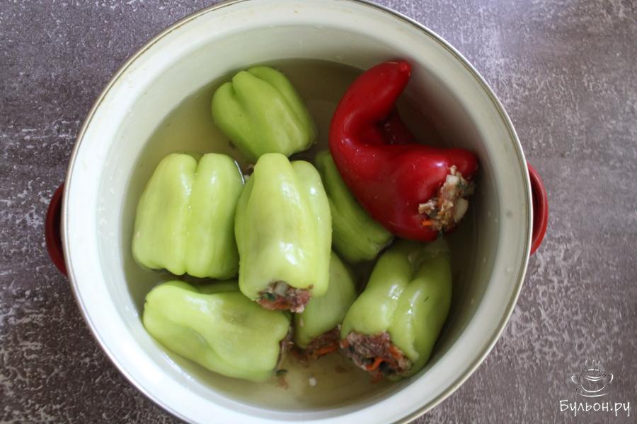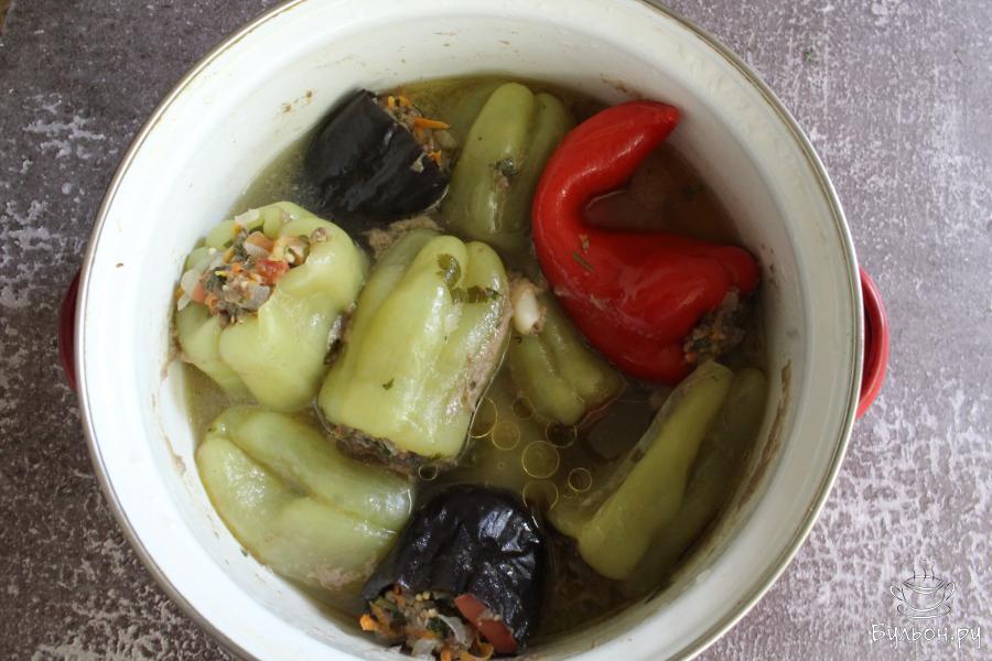 6. Готовить перцы под крышкой, на небольшом огне, после закипания 30-35 минут. Таким образом можно приготовить фаршированные баклажаны. Для примера я добавила два кусочка баклажана, наполнив их фаршем.