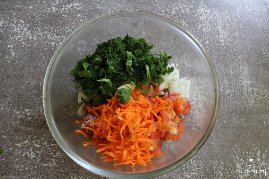 1. Овощи почистить и промыть. У перцев аккуратно убрать хвостик и серединку с семечками. Лук и помидоры мелко нарезать и добавить в фарш.